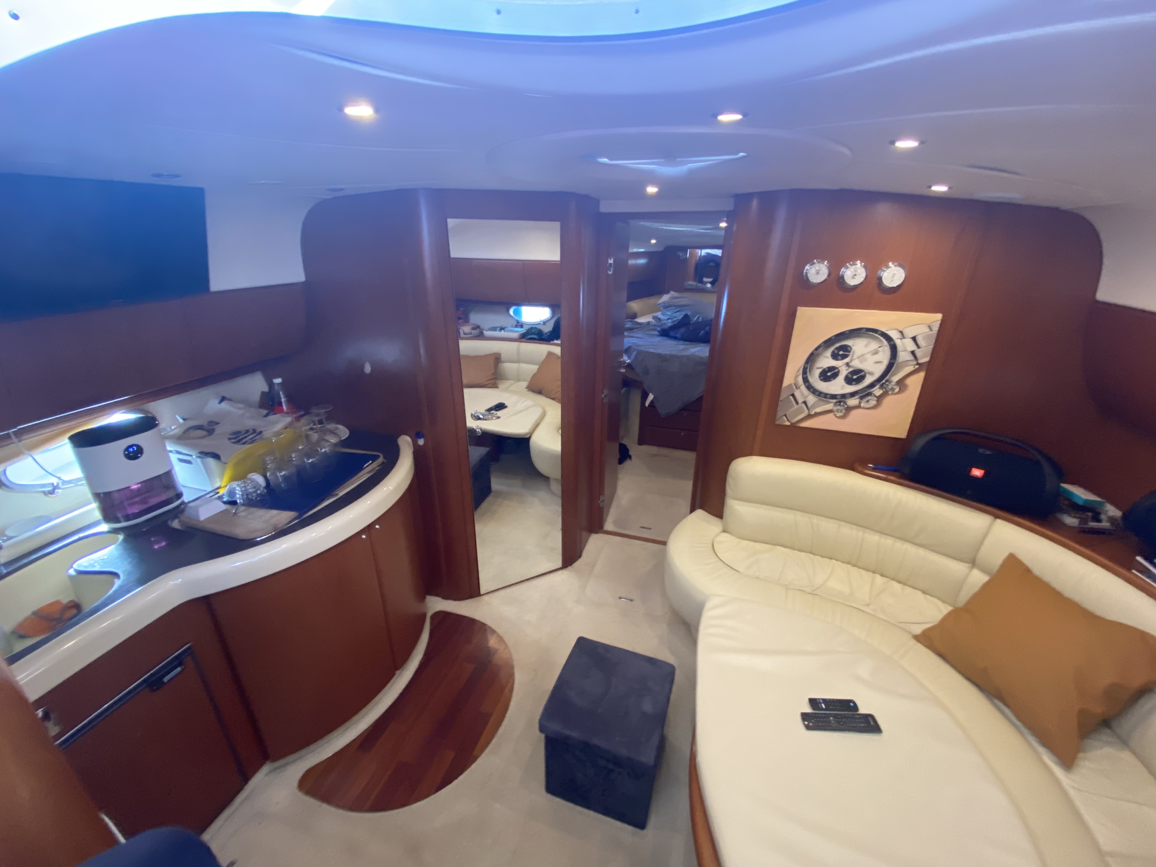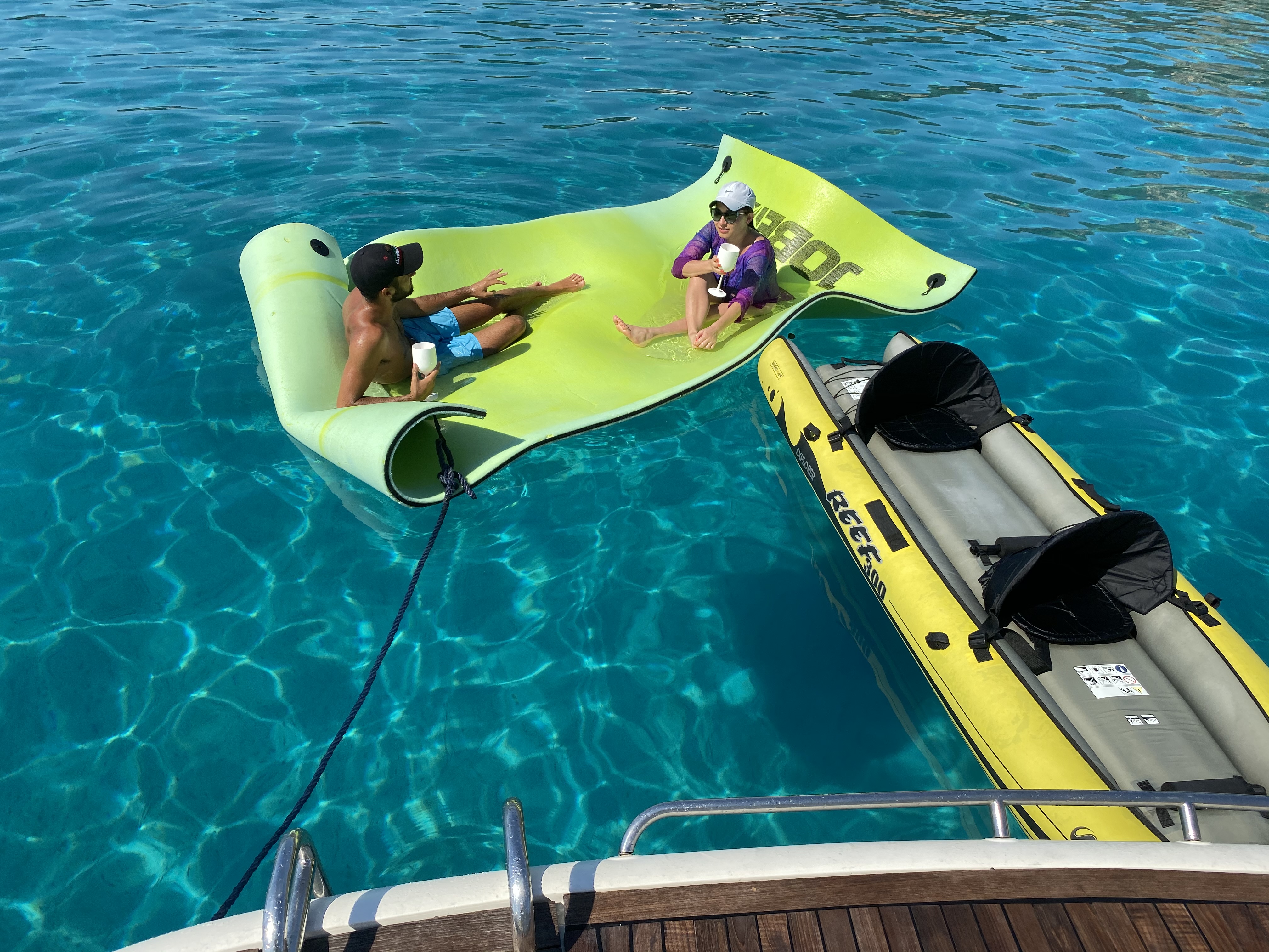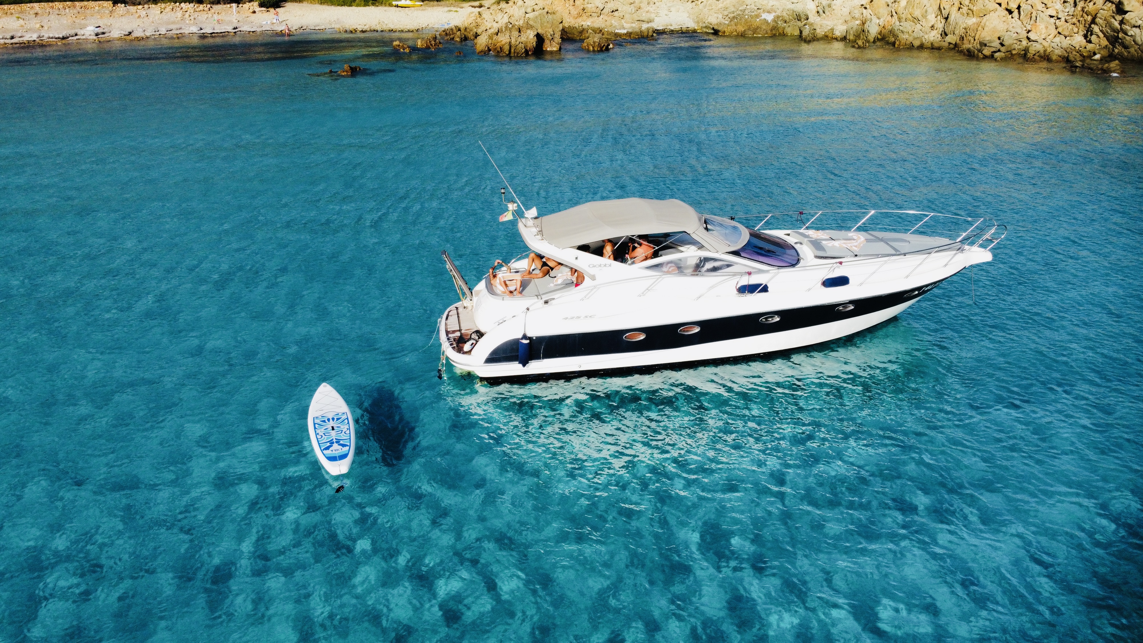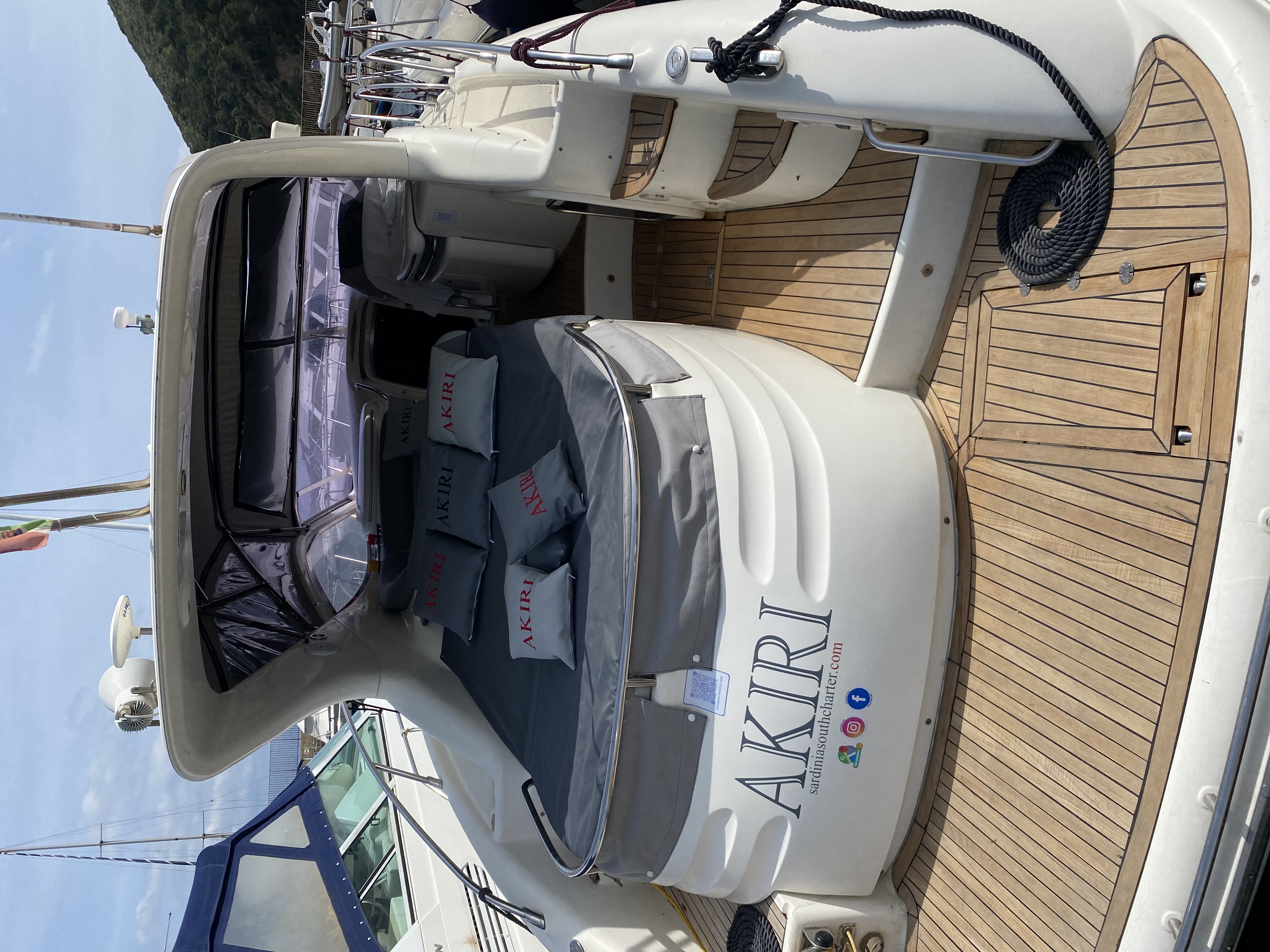 Comodissima imbarcazione dotata di aria condizionata due bagni due cabine matrimoniali . Grandissimi prendisole a prua e poppa, tappeto galleggiante ,4 acqua Scooter elettrici , canoa gonfiabile a 2 posti , SUP e cuscino galleggiante per stare comodamente sdraiati sull’acqua. Si potranno visitare le bellissime grotte di PINIS Village, le baie di CHIA e la bellissima spiaggia di Tuerredda e Perdalonga