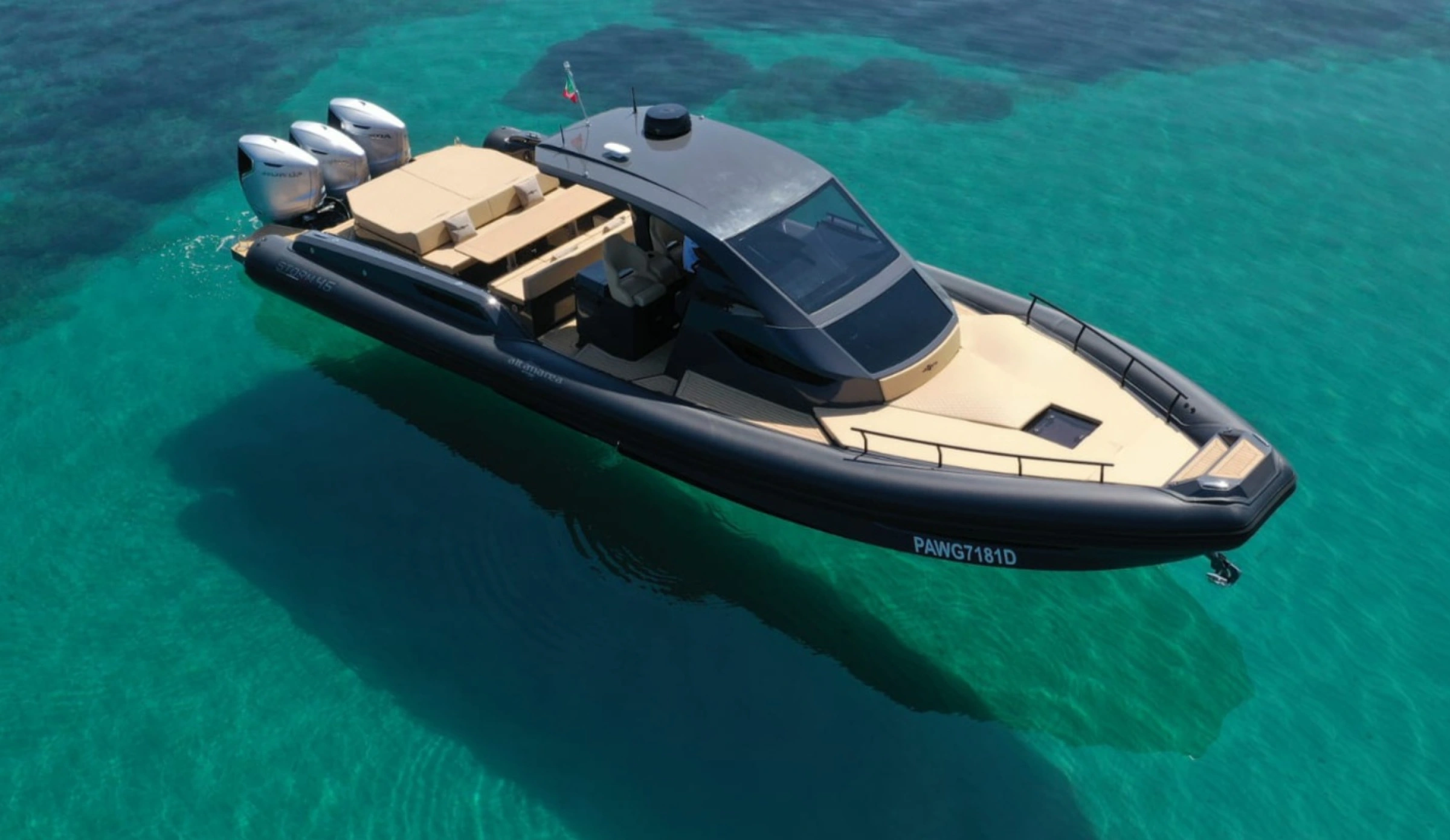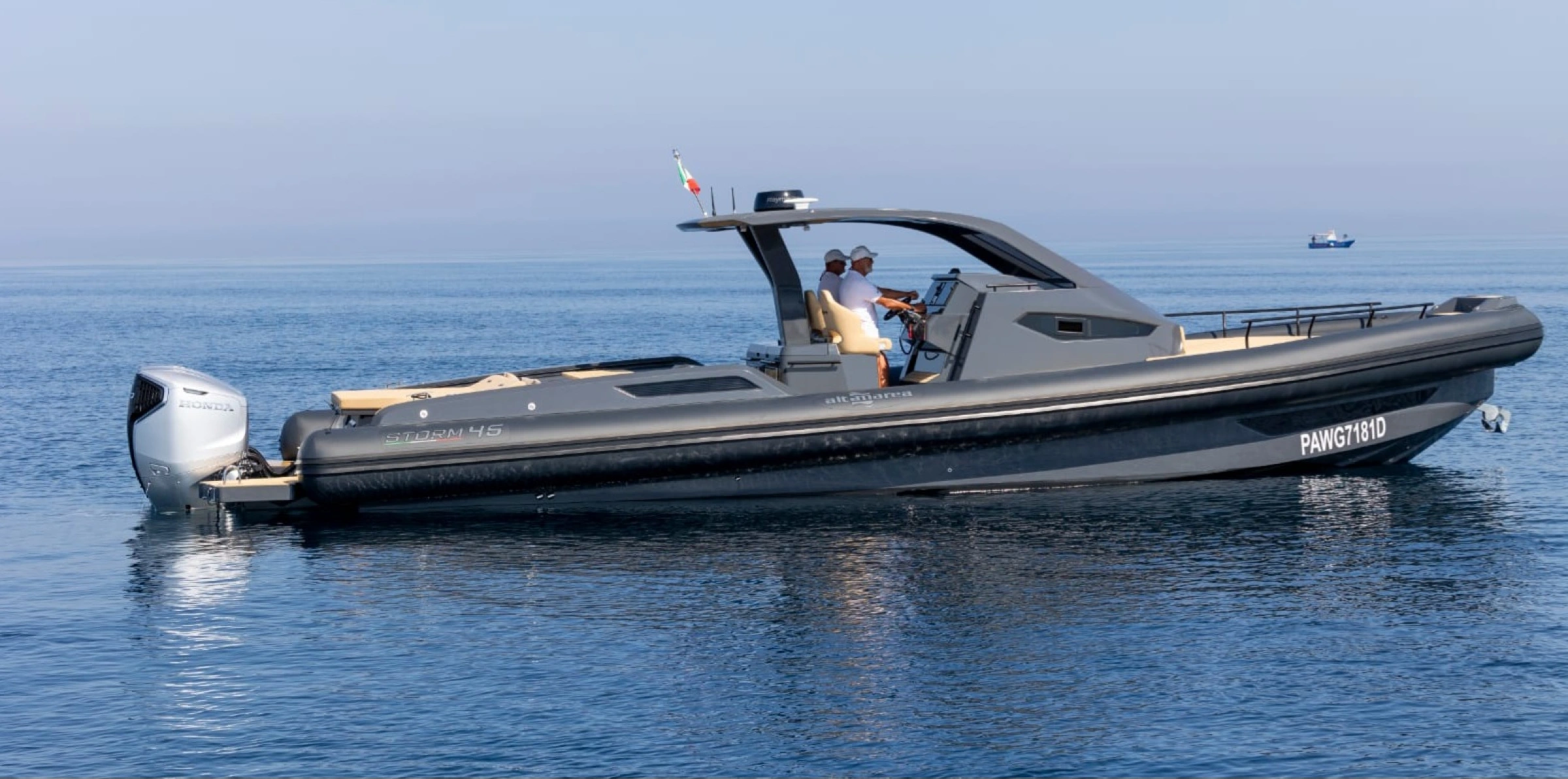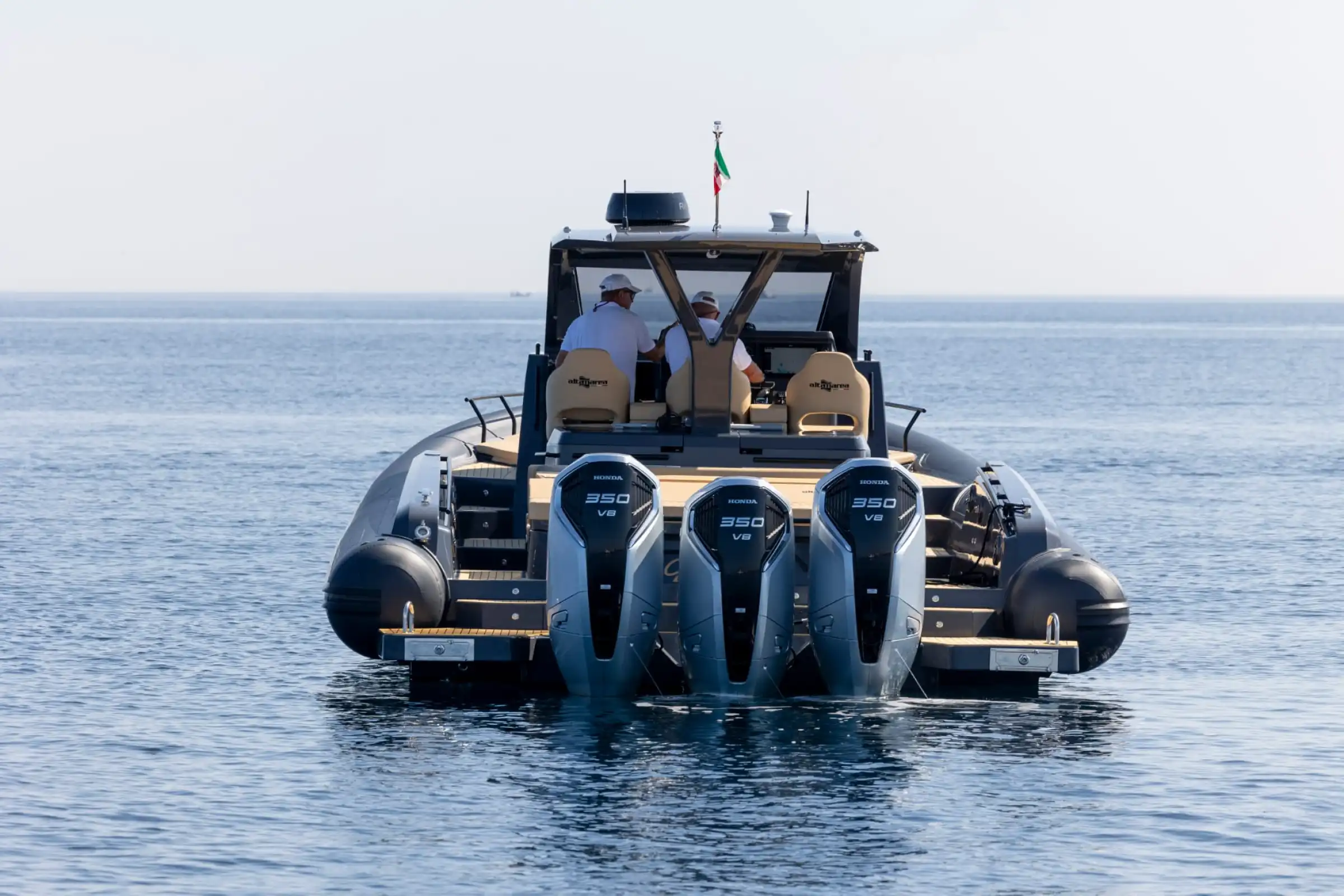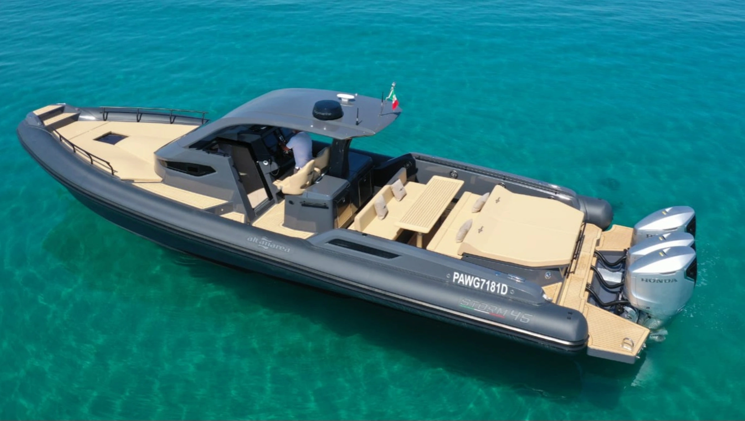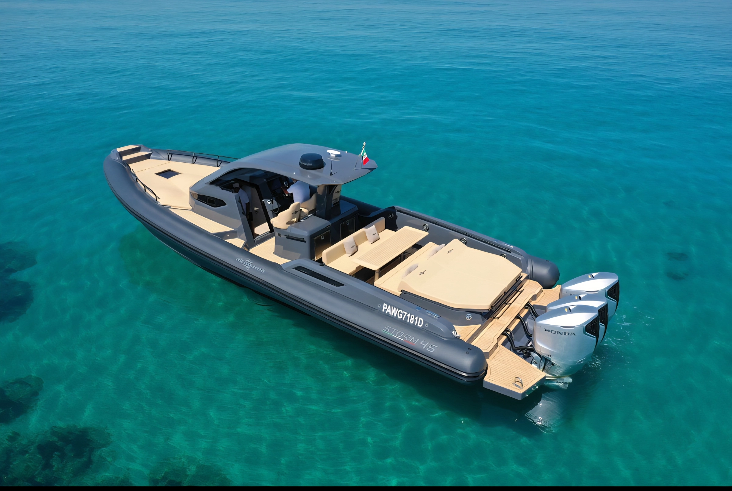 L’ammiraglia della nostra flotta L'Altamarea Storm 46 è un natante di 13,70 metri di lunghezza, progettato per il divertimento sportivo in mare, con un ponte ampio e un grande volume a prua. Questo natante è disponibile con tre motori fuoribordo da 350 CV Honda. È dotato di una cabina spaziosa. Una cucina all'aperto protetta da un grande T-Top, e un'area centrale con una dinette convertibile. La cabina sotto coperta offre due letti matrimoniali e un bagno separato, Tv satellitare, aria condizionata. L'Altamarea Storm 46 è progettato per soddisfare i tuoi gusti , con due ampie aree per godere del sole tra i ponti di prua e di poppa, e un'area centrale spaziosa con una dinette convertibile e una grande cucina all'aperto protetta da un grande T-Top.