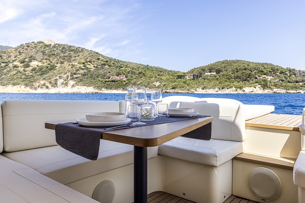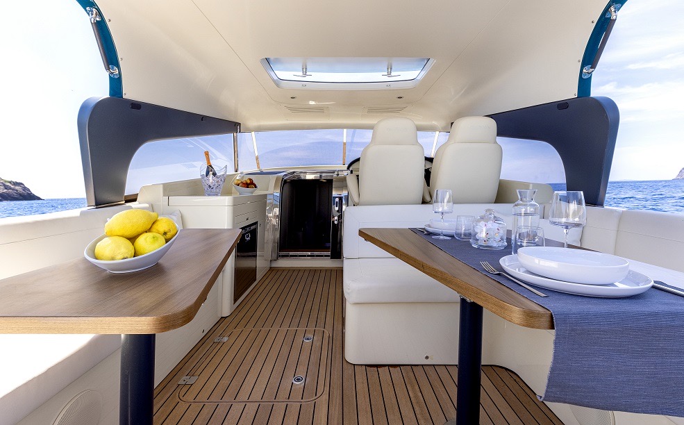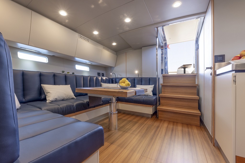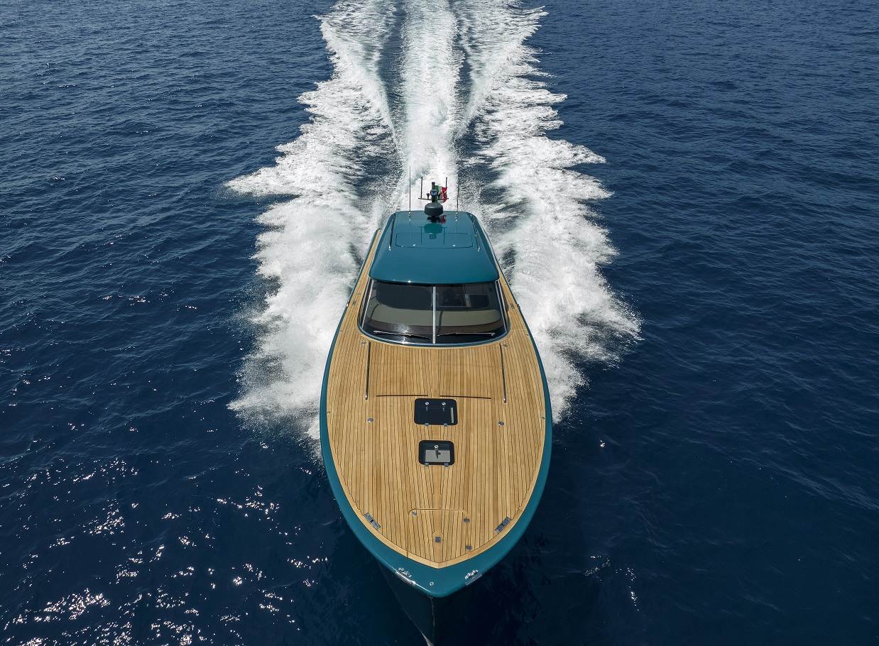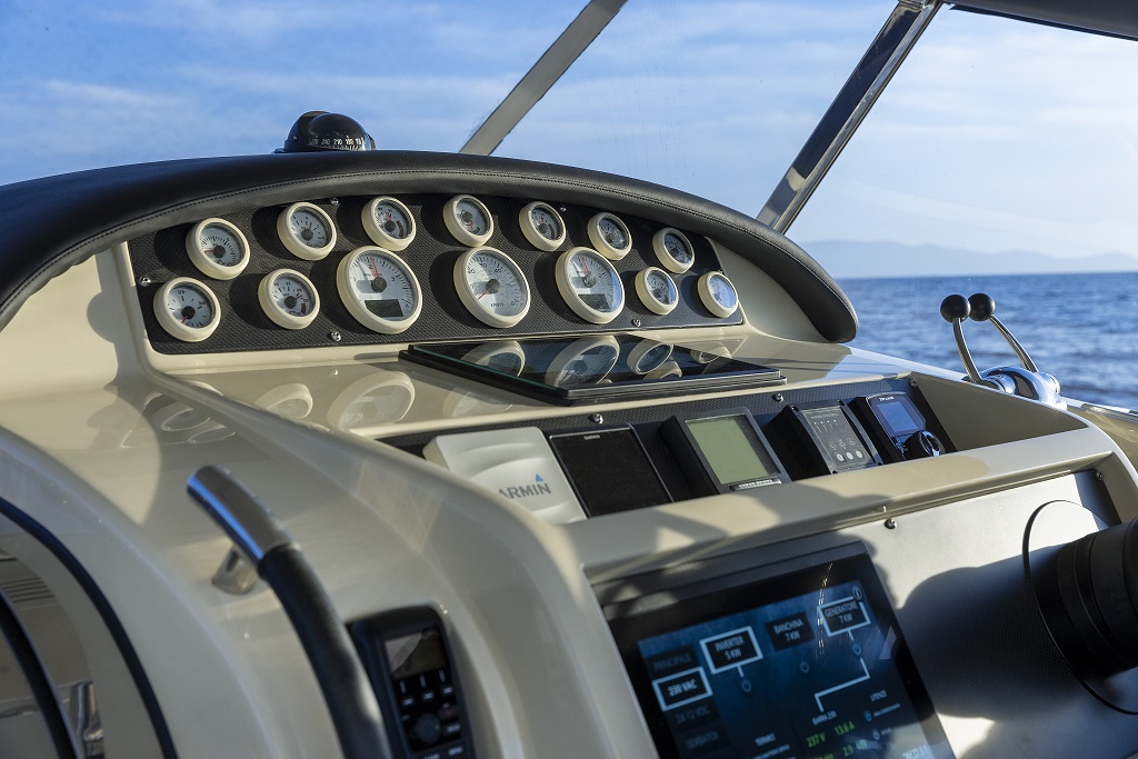 MD51 è un motoryacht che sfrutta al meglio l’esperienza degli esperti della Maxi Dolphin: l’uso di materiali compositi, l’applicazione di tecnologie avanzate e il design dello scafo con un’eccellente efficienza idrodinamica. Il progetto porta la firma di Roberto Starkel. Un mega-tender super moderno di ispirazione retro. La sua forma, basata sullo stile delle barche a motore degli anni ’30, fa da contrasto ai materiali di ultima generazione: l’intera imbarcazione è costruita con la tecnologia Sprint, che le conferisce forza e impareggiabile leggerezza. I macchinari sono dei capolavori della tecnologia: l’MD51 ha due motori 453-HP Volvo Penta IPS 600. IPS (Inboard Performance System) è il nuovo rivoluzionario sistema di propulsione sviluppato dalla Volvo Penta. La posizione delle eliche accresce enormemente l’efficienza del sistema, offrendo più velocità, accelerazione e ottime prestazioni in generale. Inoltre, grazie alla significativa riduzione di consumo di carburante, l’autonomia aumenta notevolmente. La manovrabilità simile a quella dell’automobile permette una perfetta conducibilità anche ad alta velocità, mentre il sistema Volvo Penta favorisce facili attracchi. Il rumore e le vibrazioni prodotte sono ridotte ai minimi livelli e la scarsità dei fumi di scarico contribuiscono al comfort che si trova a bordo. MD 51 è stato concepito ponendo enfasi sull’eco-sostenibilità: la leggerezza, combinata con l’ottimizzazione del design dello scafo, favorisce l’impianto di macchinari con potenza inferiore rispetto agli altri yacht di simili dimensioni. Per questo motivo, con le stesse prestazioni, MD51 è in grado di consumare basse quantità di carburante (all’incirca 100 l/h a velocità di crociera), avere una gamma di carburante più estesa (340 M a velocità di crociera) ed emissioni di CO2 ridotte. Per questo yacht in particolare la Maxi Dolphin ha sviluppato le prime applicazioni per l’I-Pad Apple in grado di controllare i device elettrici ed elettronici a bordo di MD 51, così come l’impianto audio. L’I-Pad si trasforma in un telecomando che, tramite Wifi, permette la gestione delle funzioni dell’imbarcazione (ad eccezione dei motori). L’uso della tecnologia CAN-bus ha contribuito alla riduzione del peso mediante l’eliminazione dei larghi cavi.
